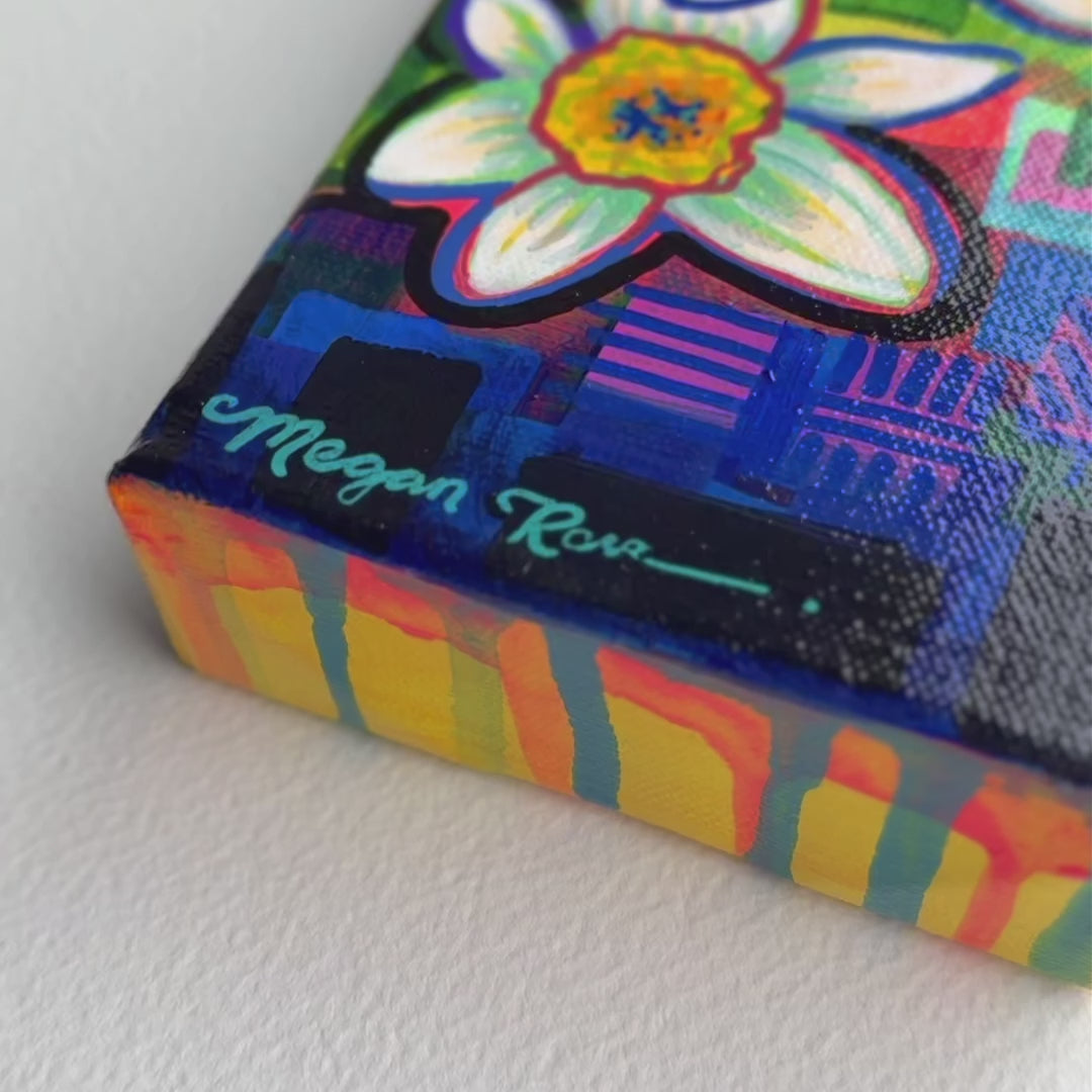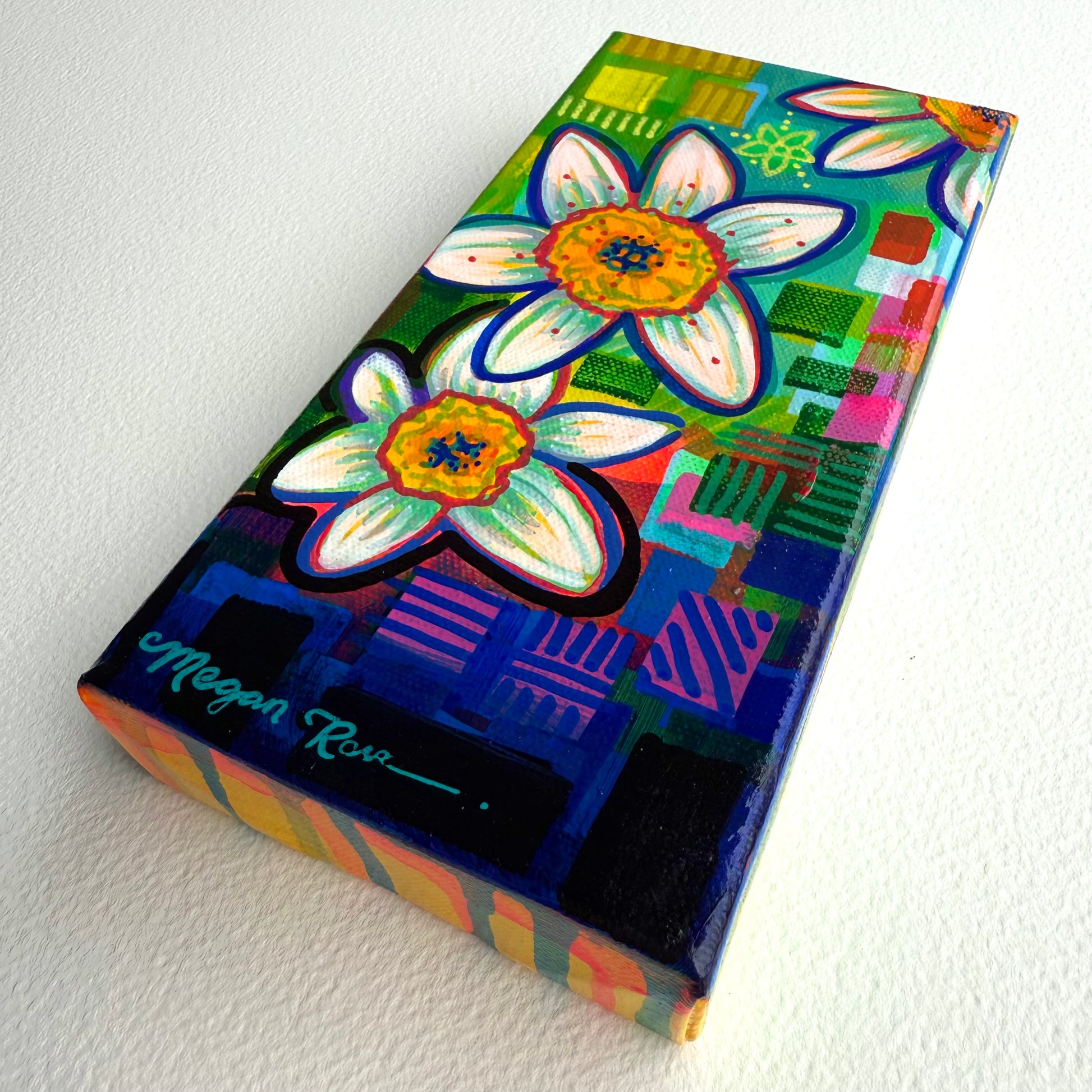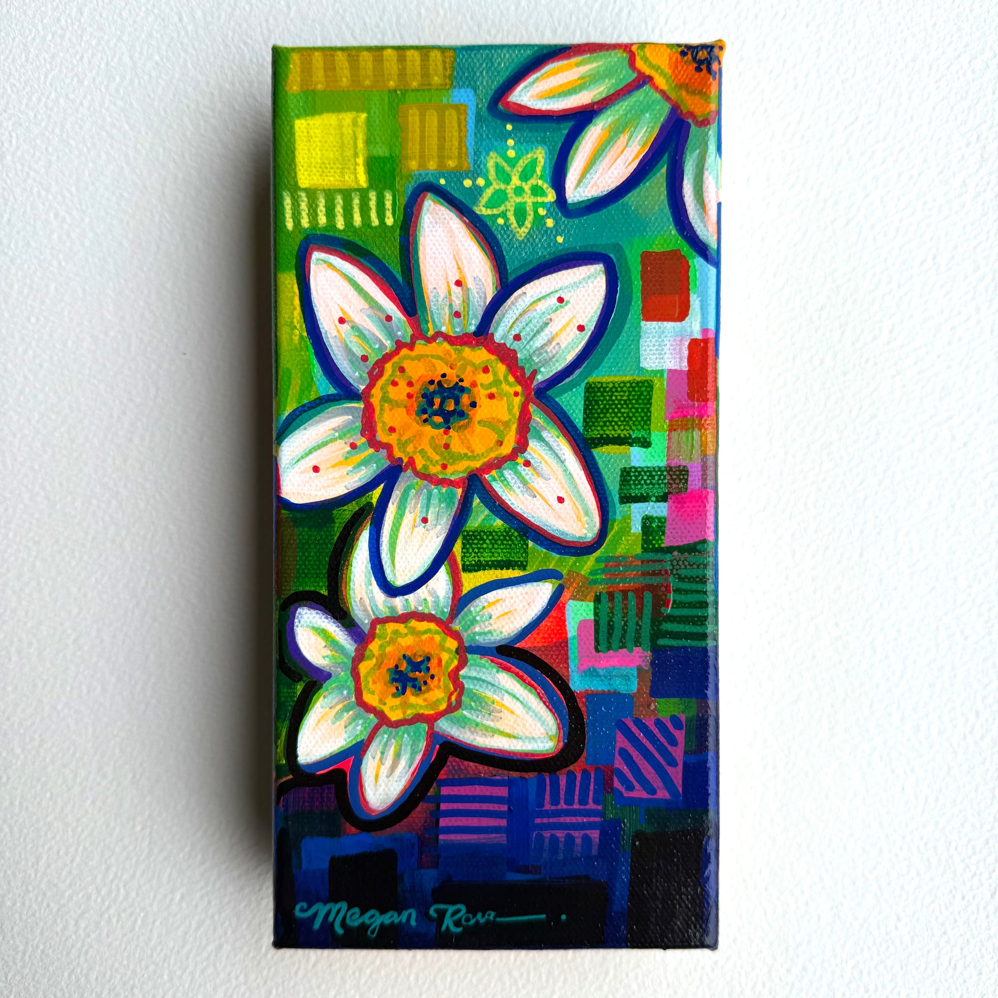 “Dainty Daffodils #4” abstract painting embellished with colorful and bold hues. Created with acrylic paint on 4 by 8 inch canvas. Unique and one-of-a-kind decor that adds joy to any room! Handmade by Megan Rose.