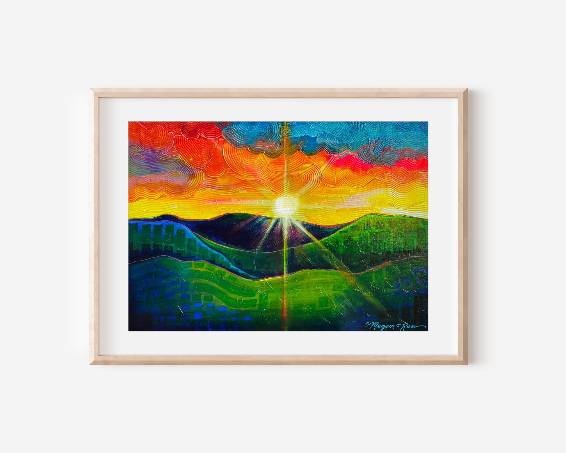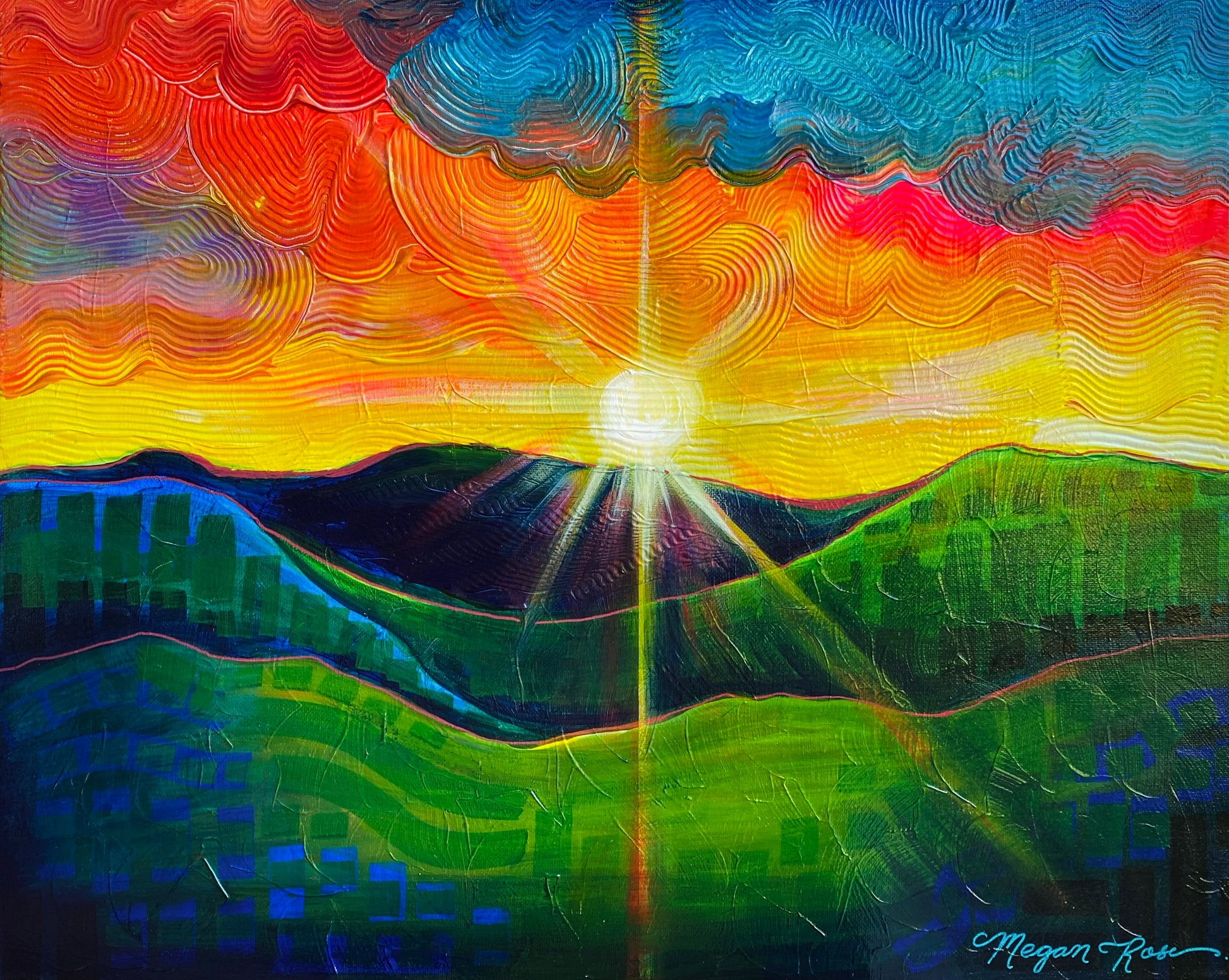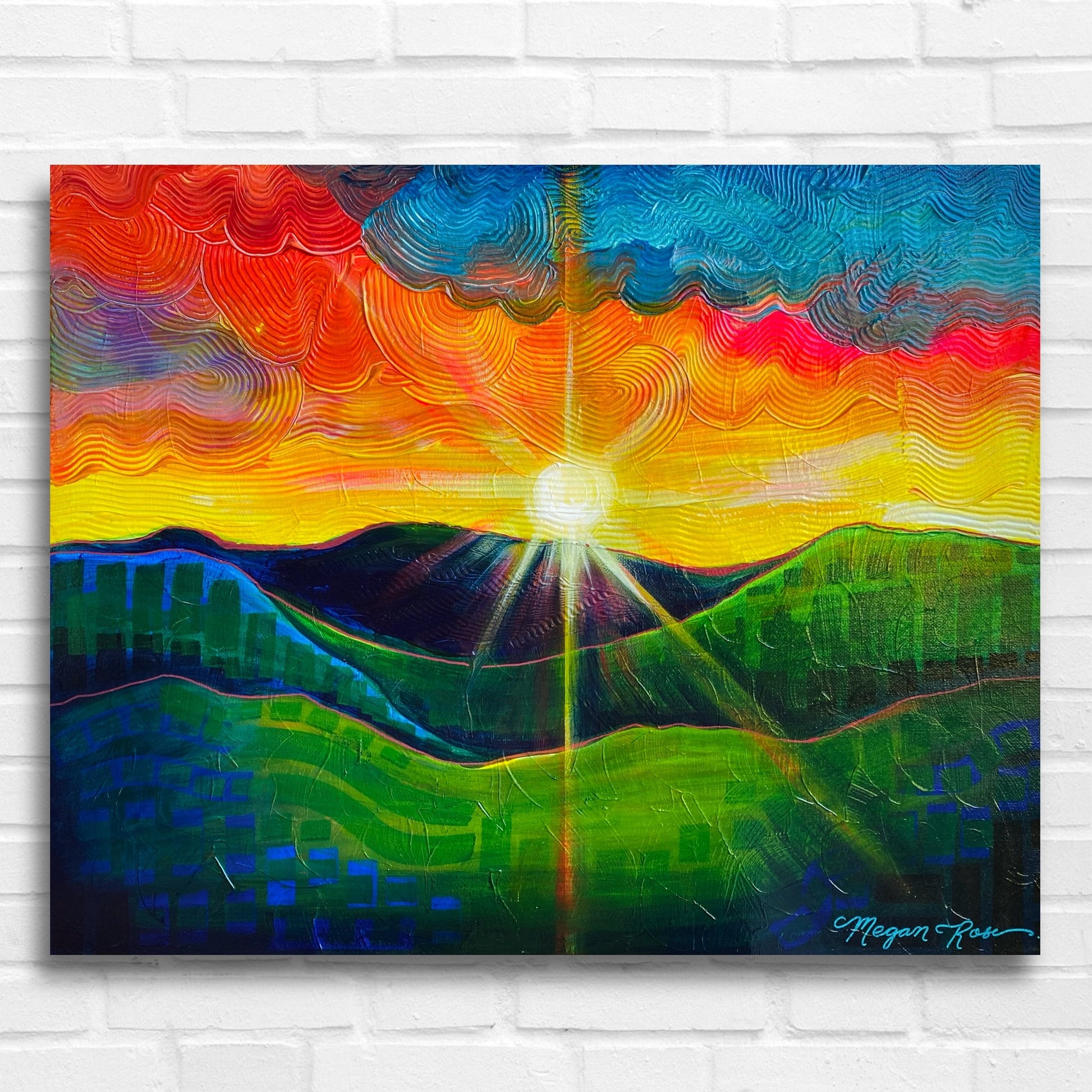 “Ephemeral Dawn” original landscape embellished with bold strokes of color. Created with acrylic paint on 16 by 20 inch canvas. Unique and one-of-a-kind decor that adds joy to any room! Hand-painted by Megan Rose.