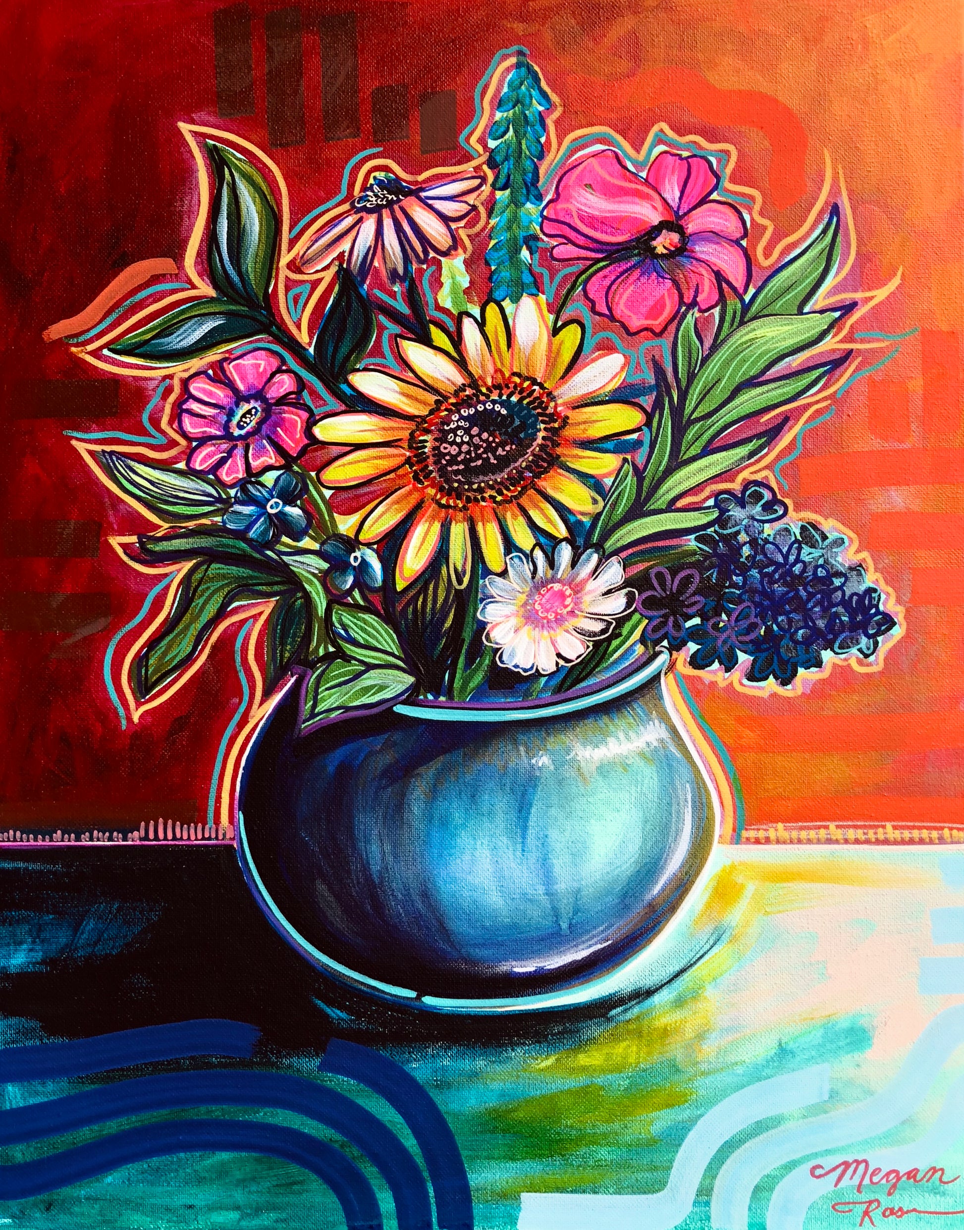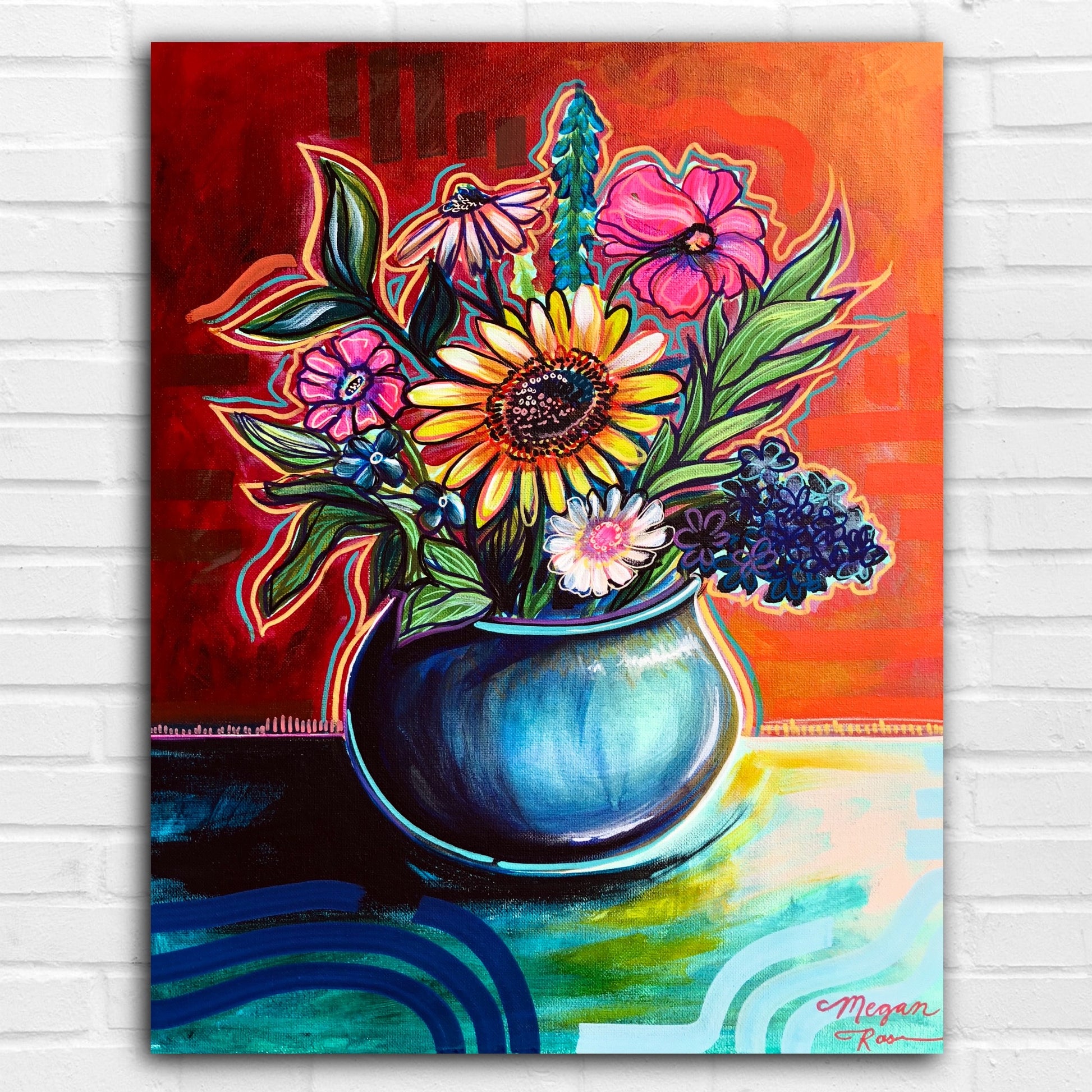 “In Full Bloom” original still life embellished with bold strokes of color. Created with acrylic paint on 16 by 20 inch canvas. Unique and one-of-a-kind decor that adds joy to any room! Hand-painted by Megan Rose.