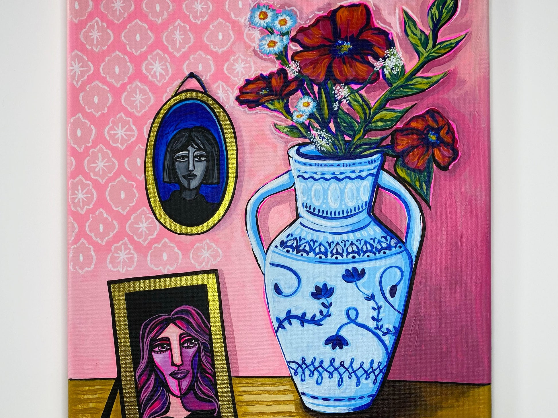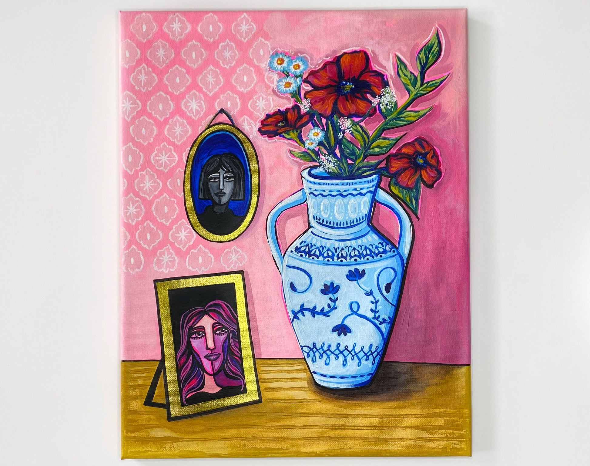 “In The Hallway” still-life floral painting embellished with colorful and bold hues. Created with acrylic paint on 11 by 14 inch canvas. Unique and one-of-a-kind decor that adds joy to any room! Handmade from Megan Rose’s “Feminine Abstraction” collection.