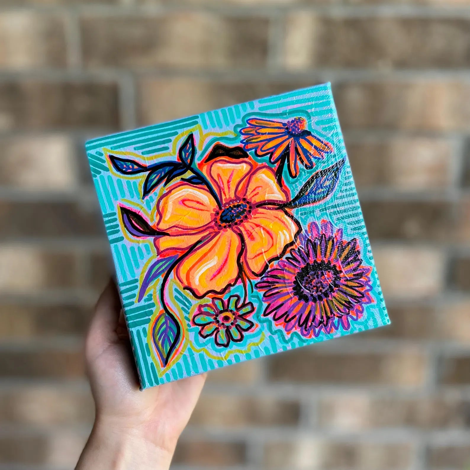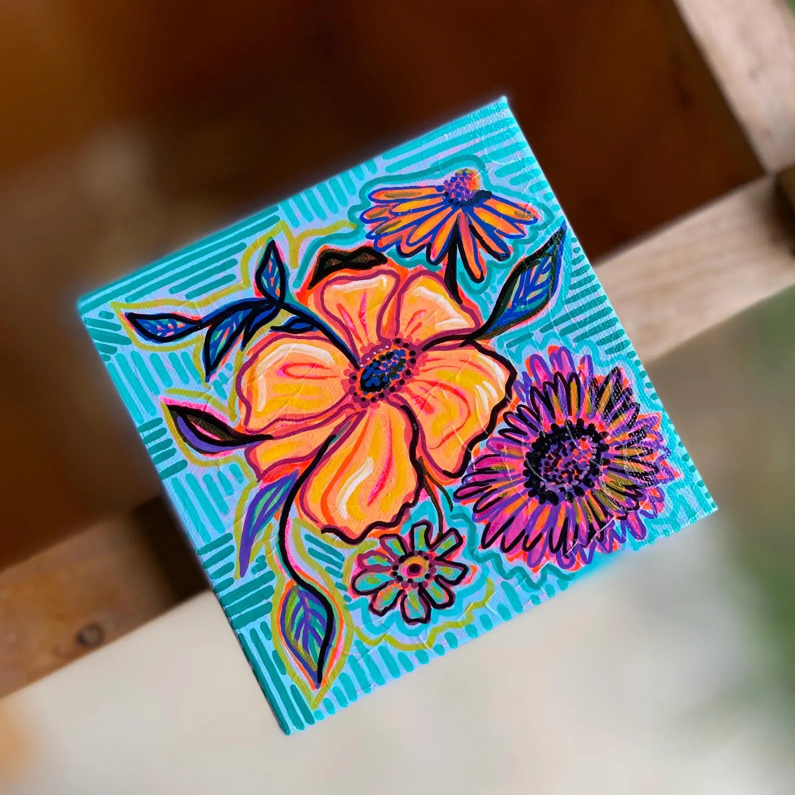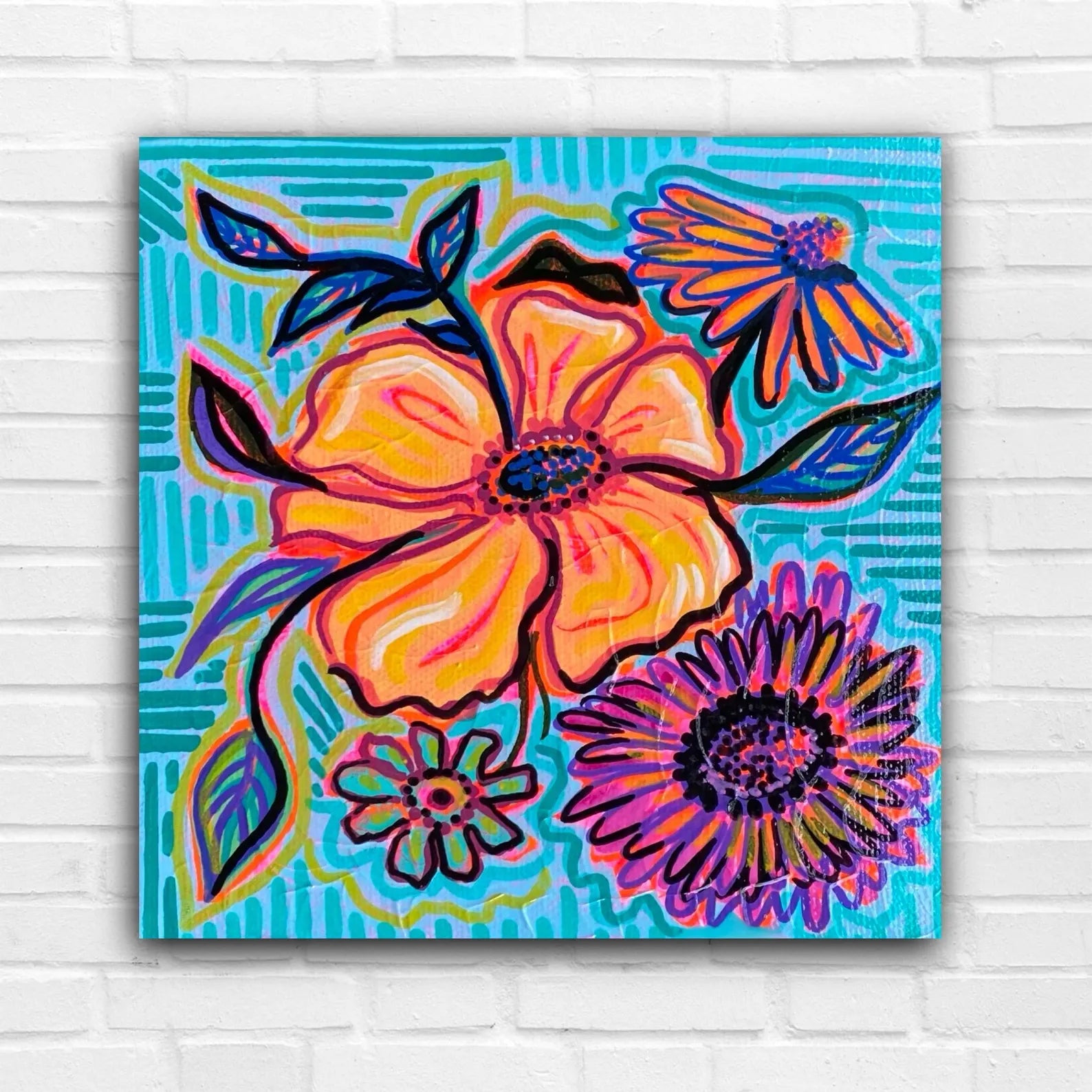 “Late Summer Bouquet” floral painting embellished with colorful, bold hues. Created with acrylic paint on 6 by 6 inch canvas. Unique and one-of-a-kind decor that adds joy to any room! Handmade by Megan Rose.
