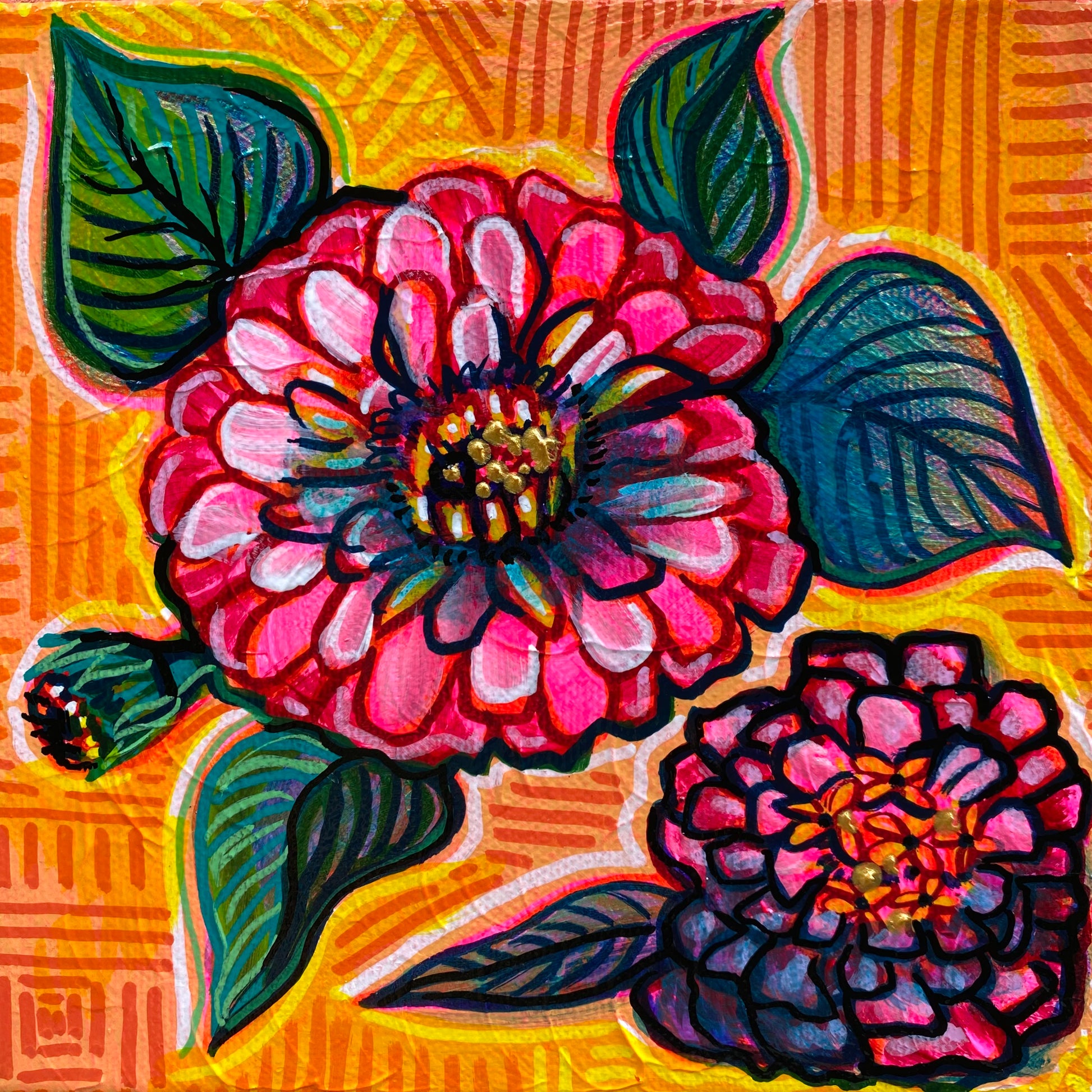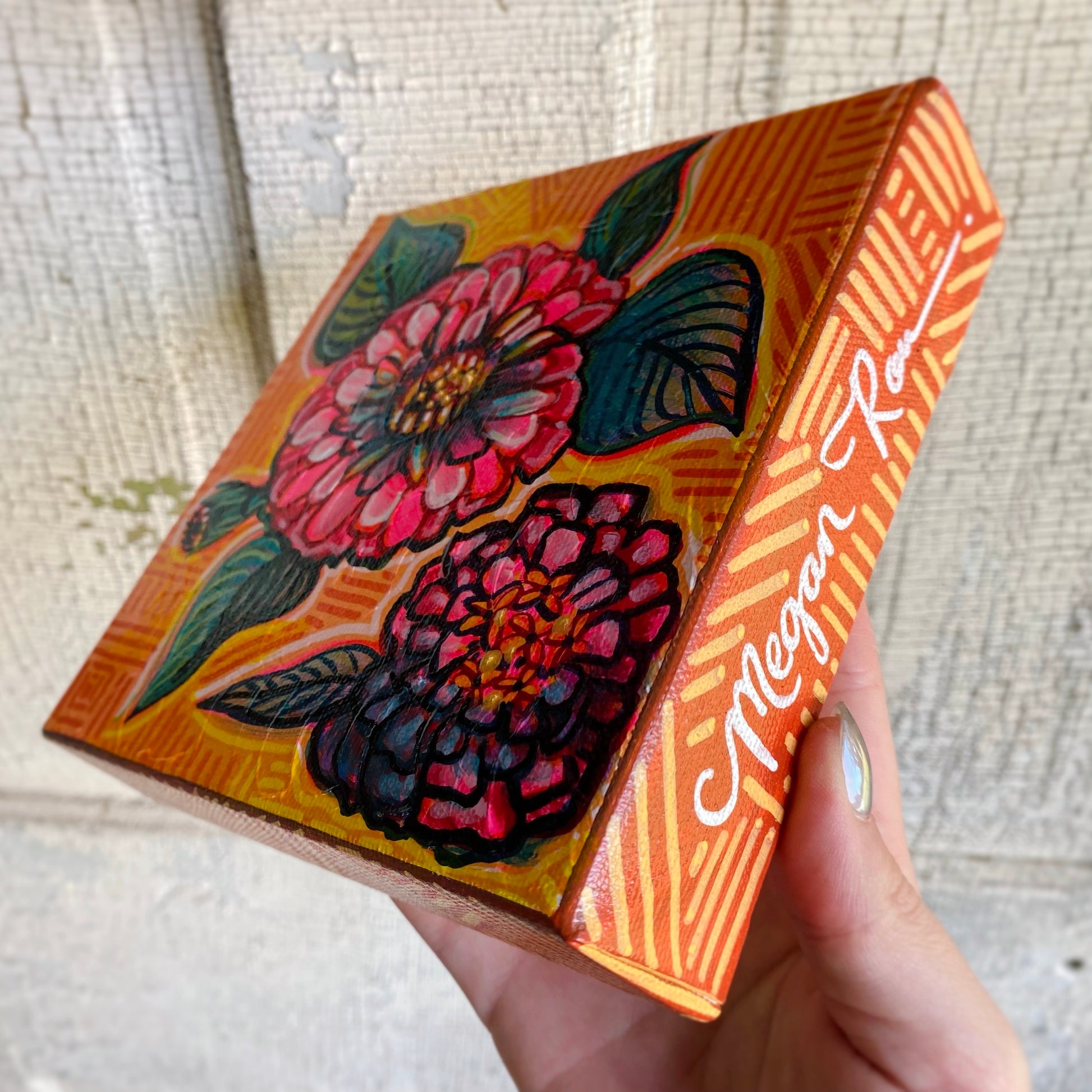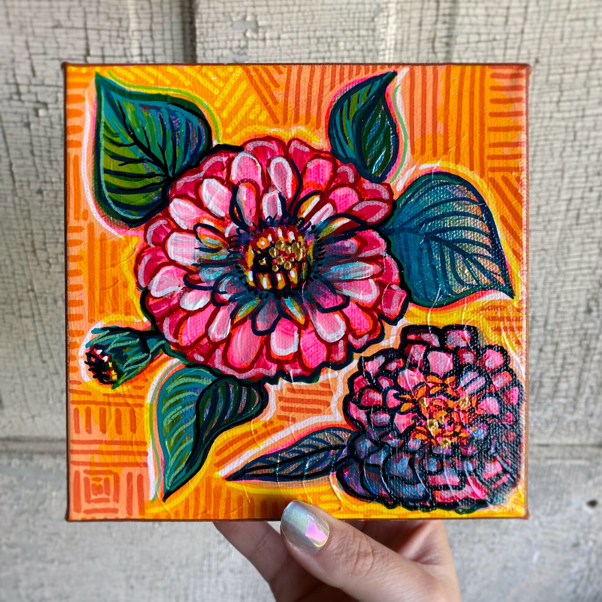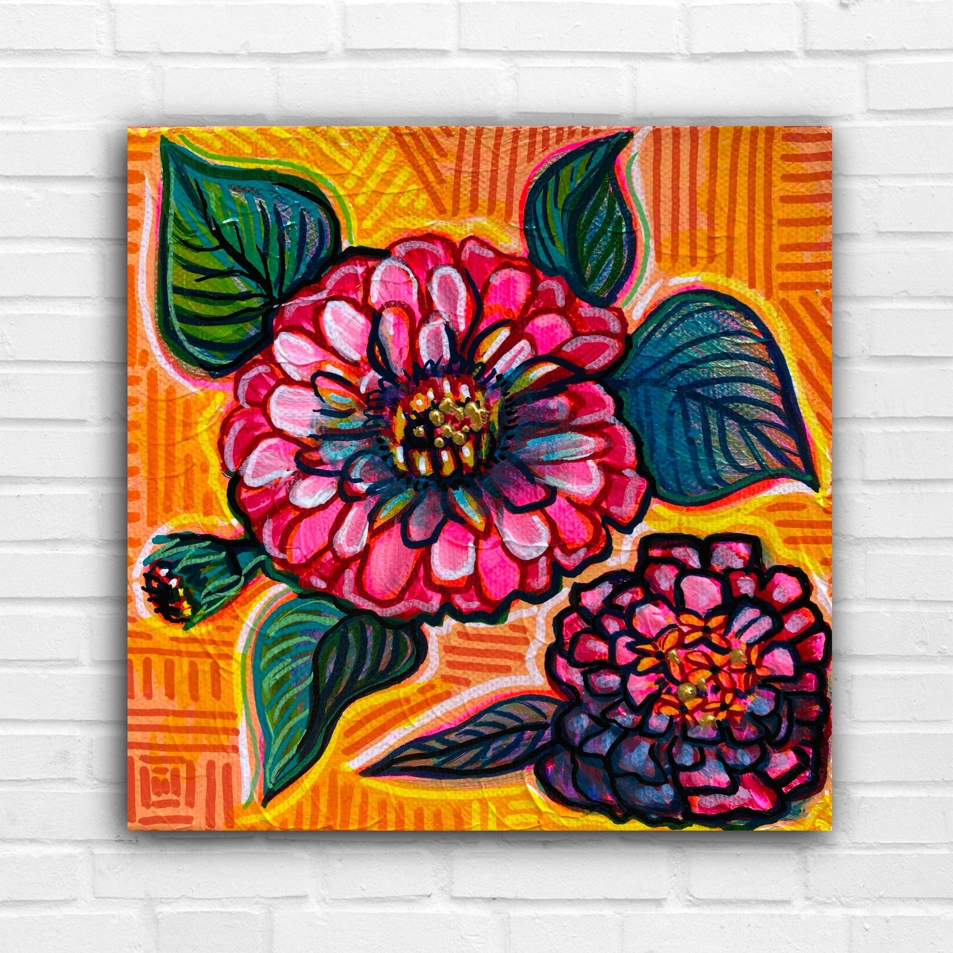 “Late Summer Bouquet II” floral painting embellished with colorful, bold hues. Created with acrylic paint on 6 by 6 inch canvas. Unique and one-of-a-kind decor that adds joy to any room! Handmade by Megan Rose.