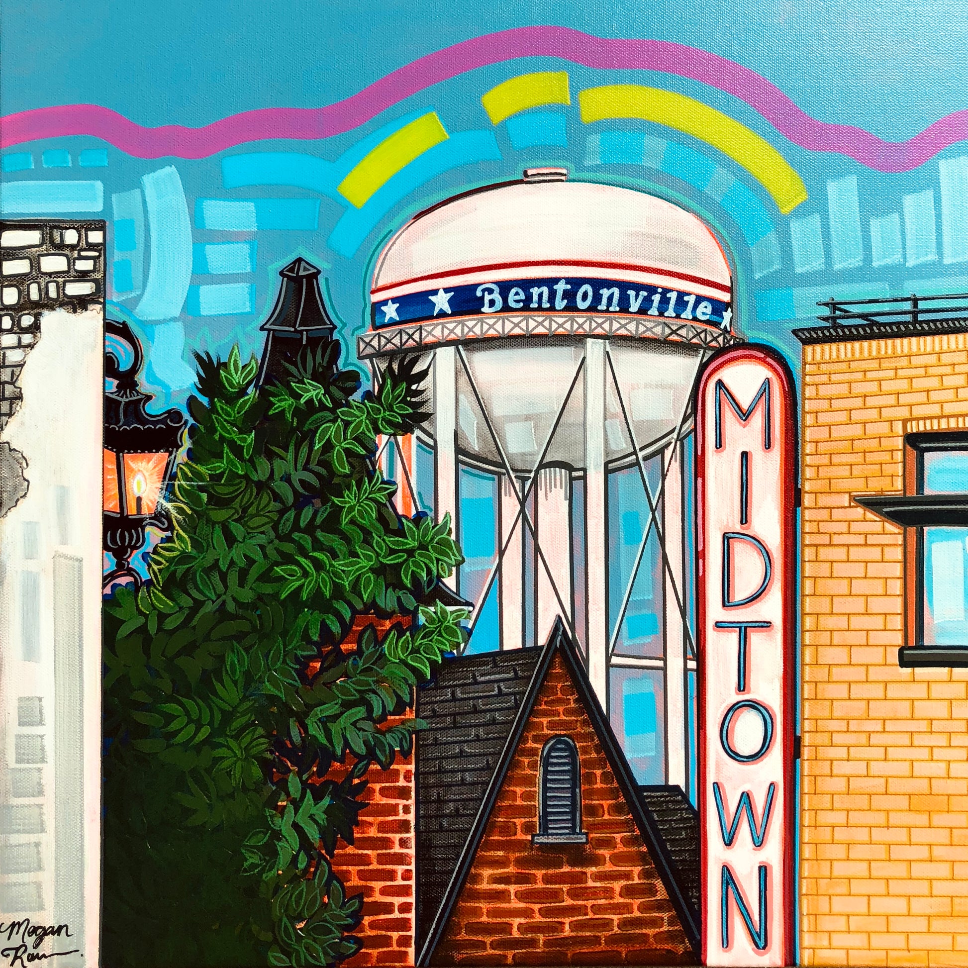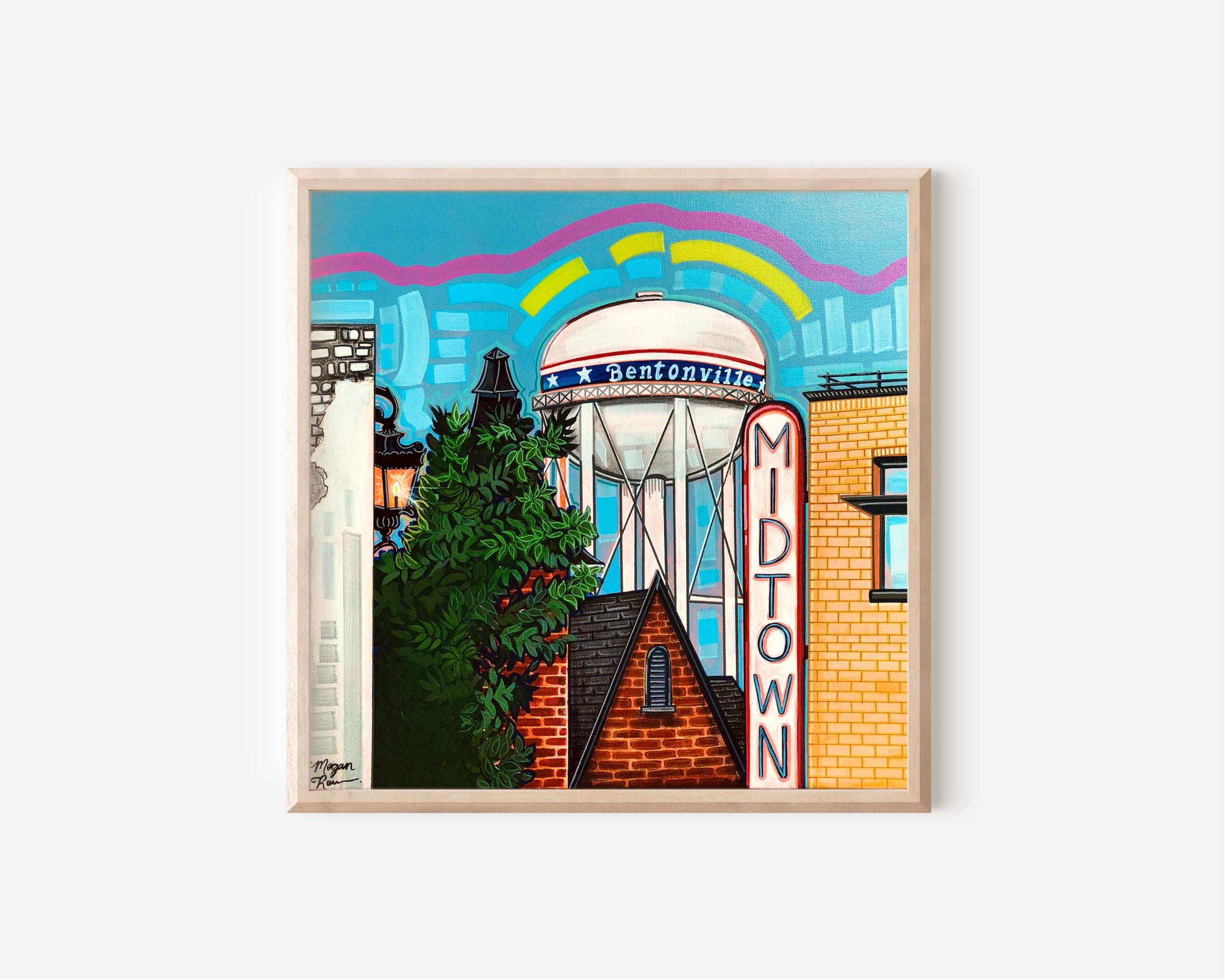 “Midtown” original painting of the Downtown Bentonville water tower in Northwest Arkansas, embellished with bold strokes of color. Created with acrylic paint on 20 by 20 inch canvas. Unique and one-of-a-kind decor that adds joy to any room! Hand-painted by Megan Rose.