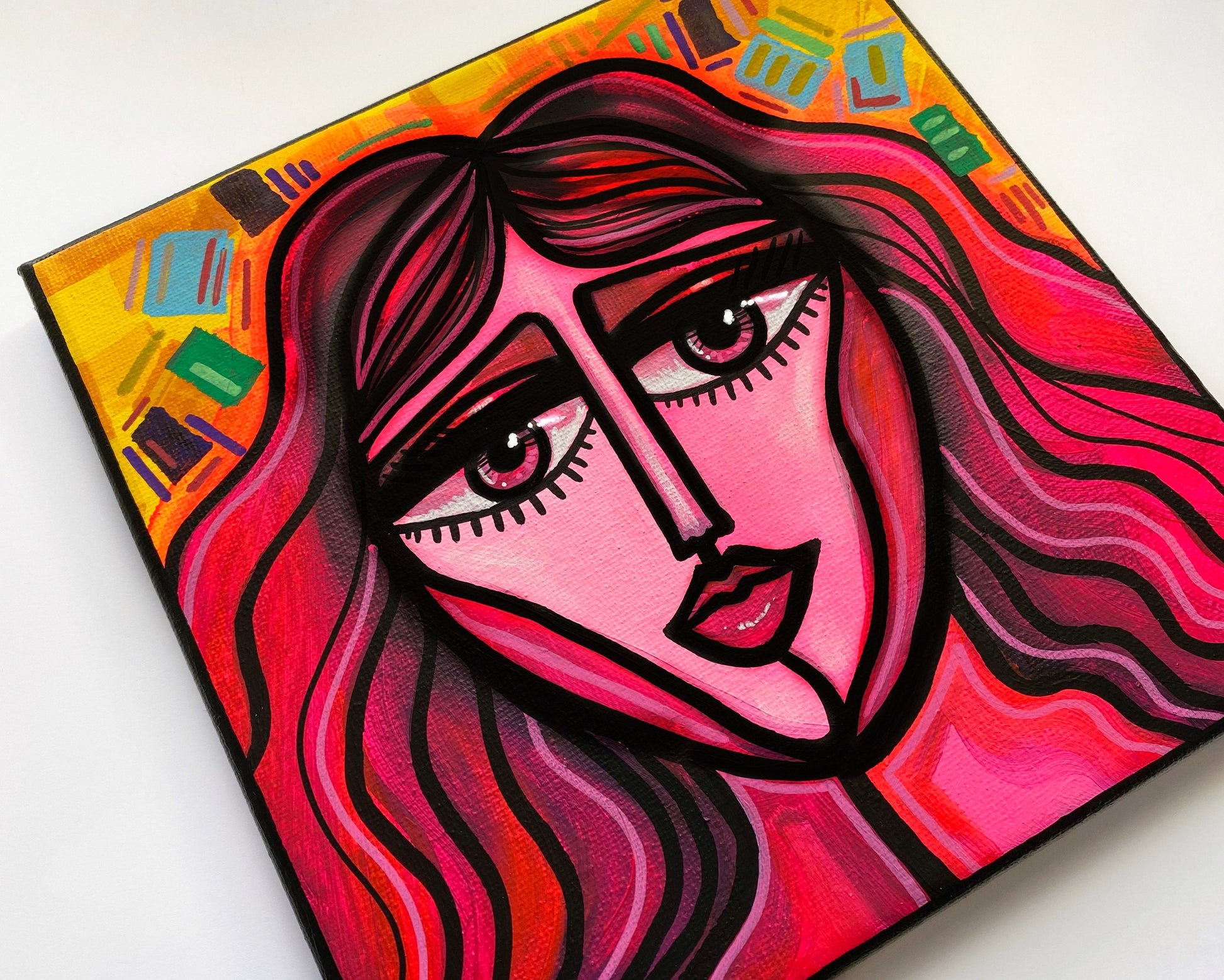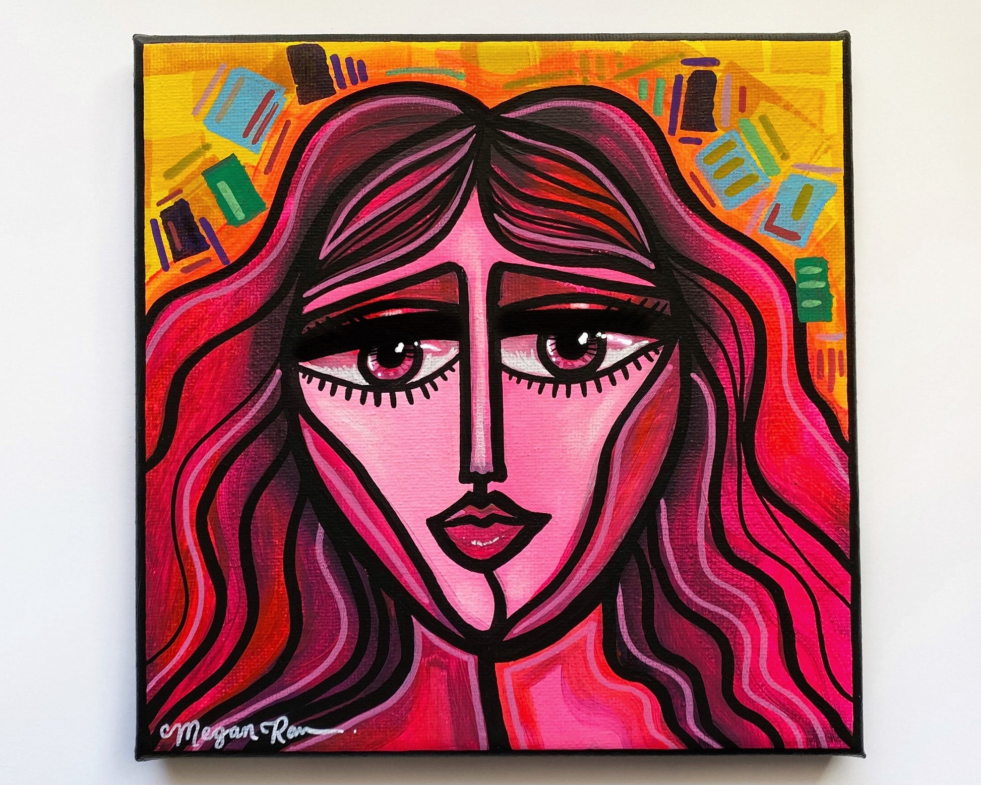 “She Is Fierce” abstract painting embellished with colorful, bold hues. Created with acrylic paint on 7 by 7 inch canvas. Unique and one-of-a-kind decor that adds joy to any room! Handmade from Megan Rose’s “Feminine Abstraction” collection.