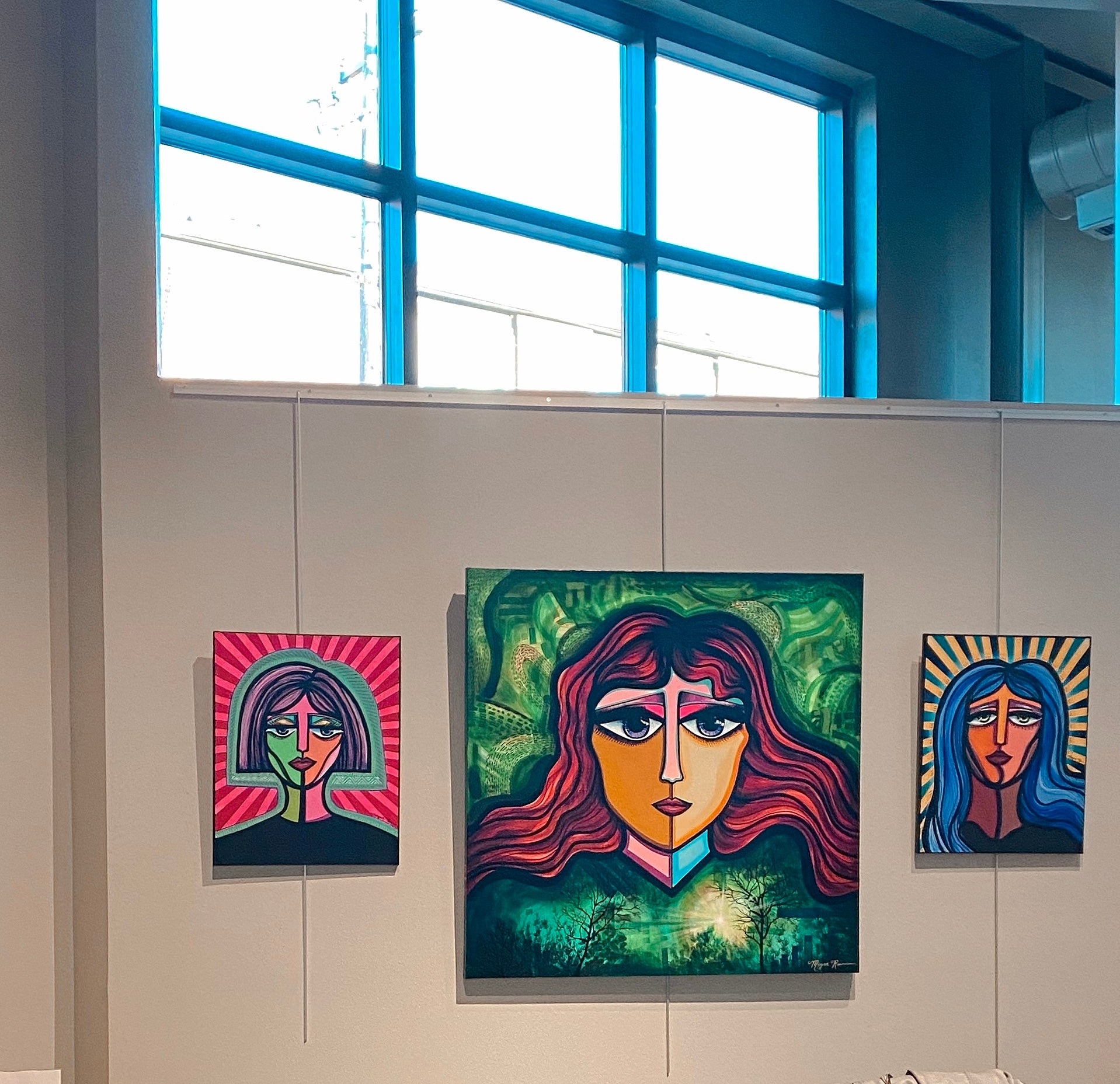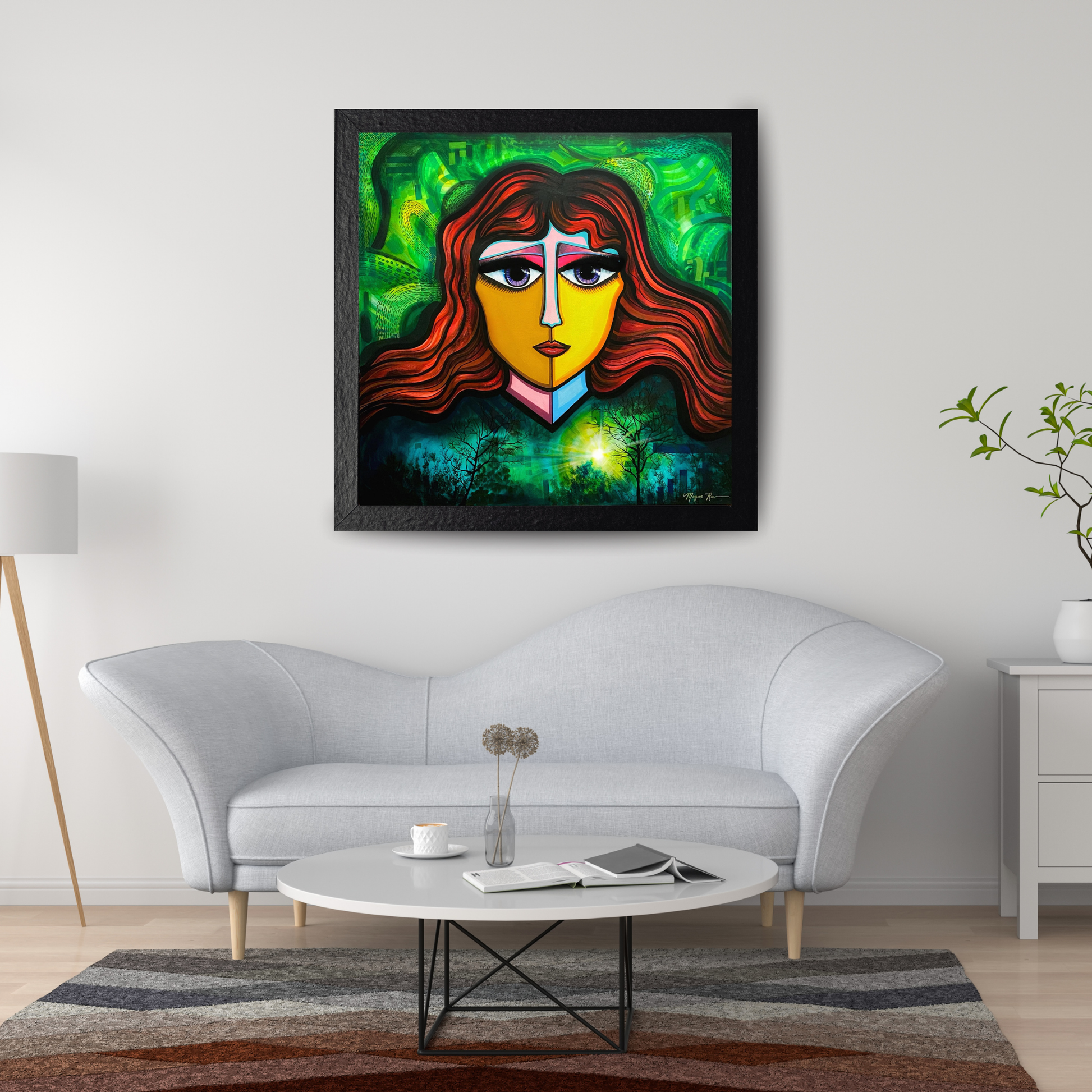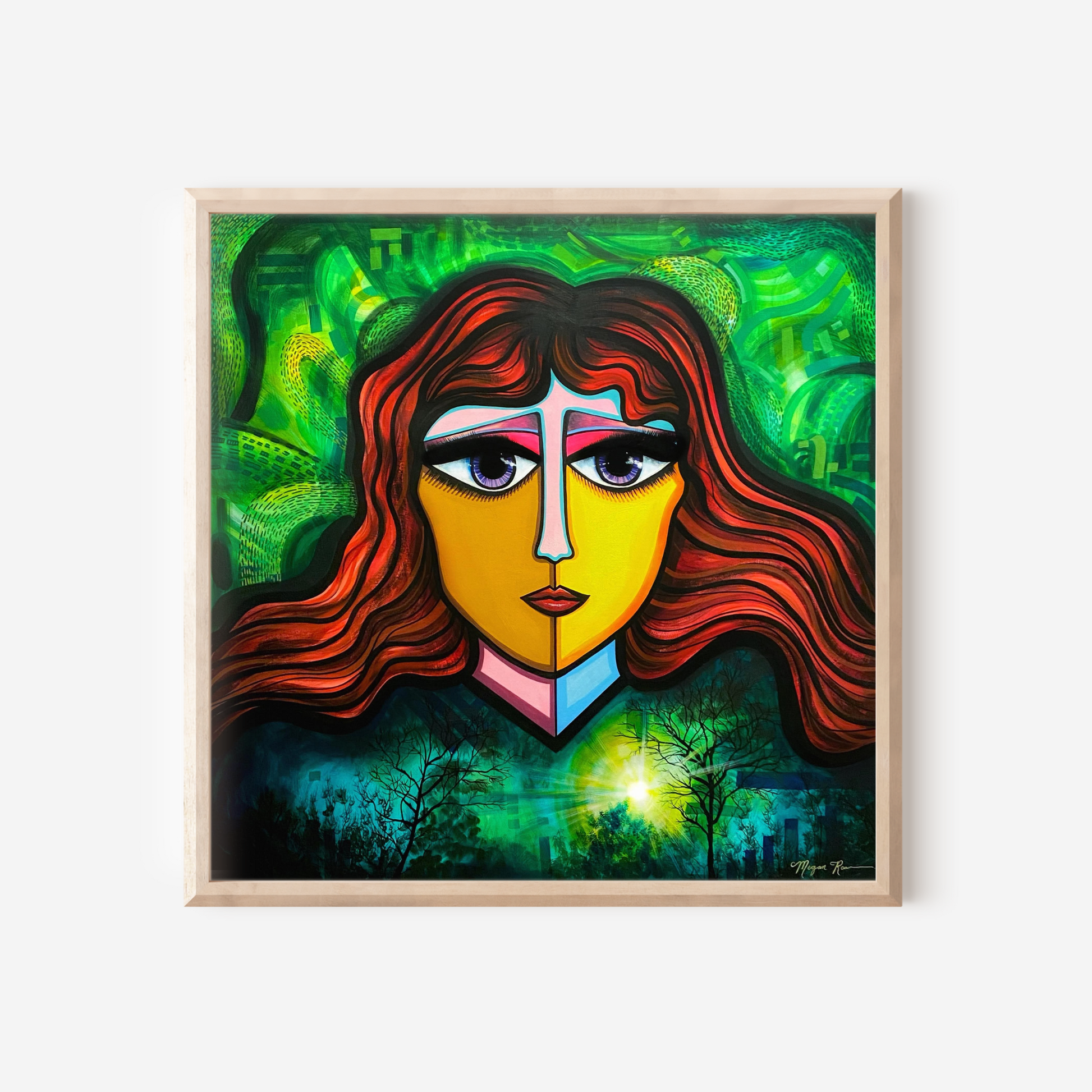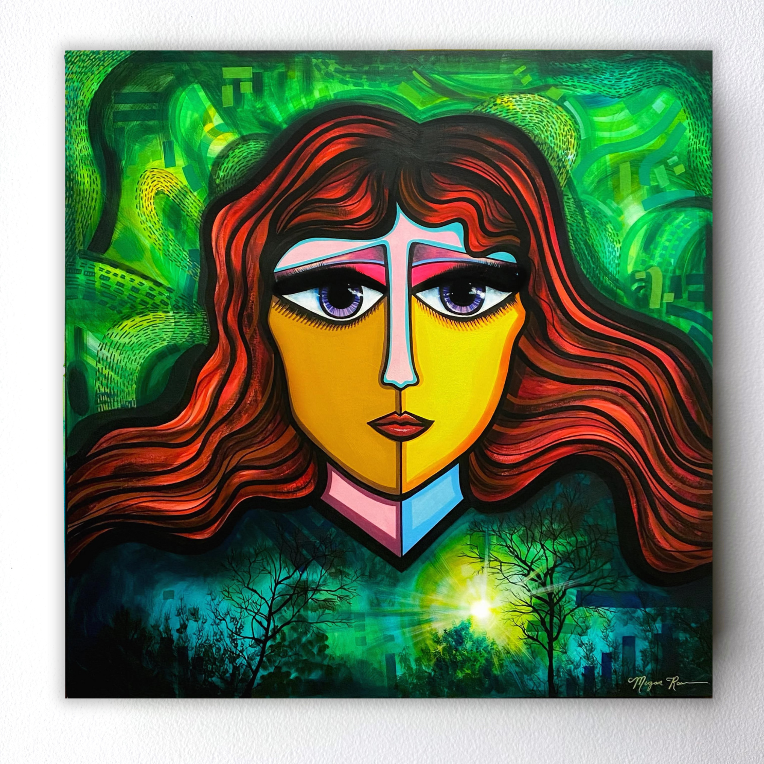"She Slept Beneath A Tree" original painting embellished with swirls and waves of color. Created with acrylic paint on 36 by 36 inch canvas. Unique and one-of-a-kind decor that adds joy to any room! Handmade from Megan Rose’s “Feminine Abstraction” collection.